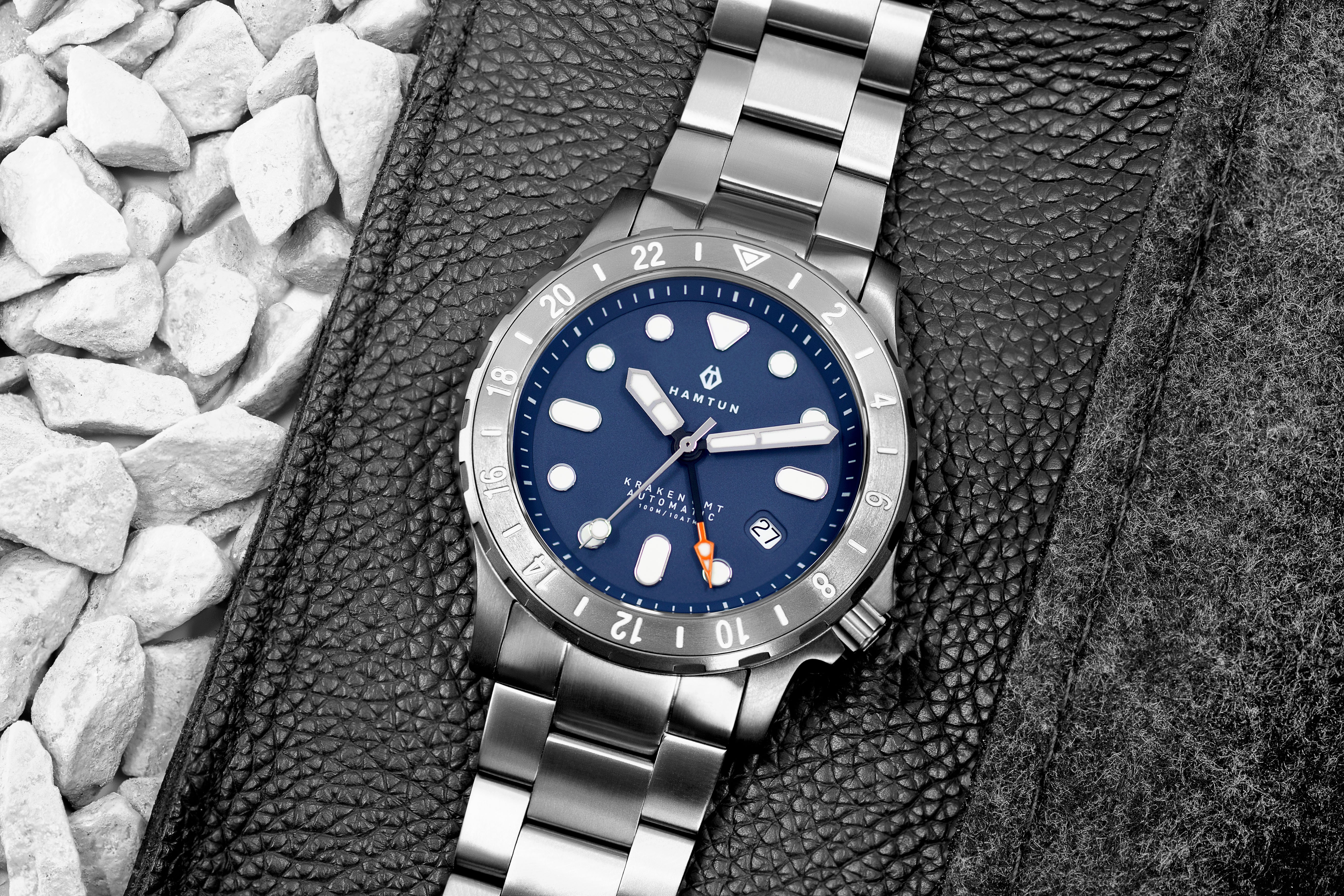 H3 is the latest iteration of our flagship dive watch model. Codenamed the Kraken, it's our best dive model yet. Why so? We start with a scratch-resistant titanium case. Incredibly light but with a finish tougher than stainless steel, our scratch-resistant titanium is a wonder on the wrist.